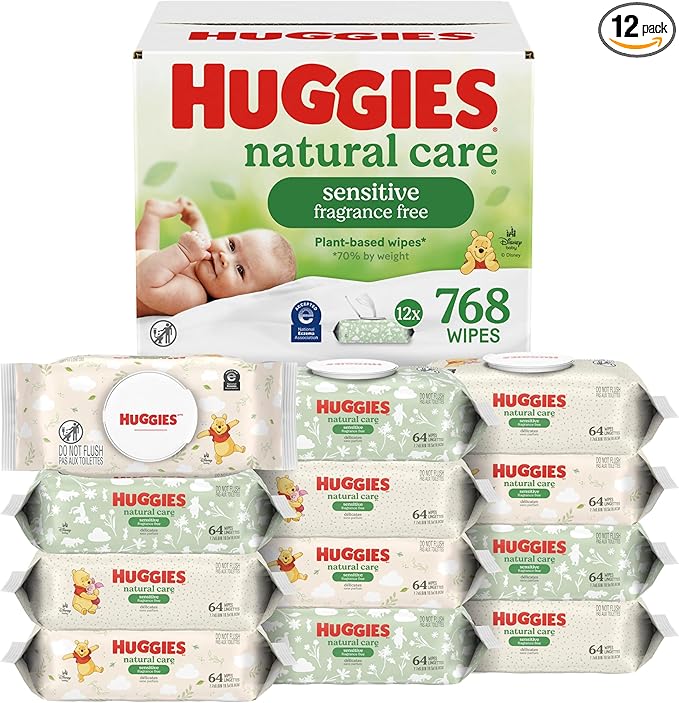 12 flip-top packs of 64 Huggies Natural Care Sensitive Baby Wipes, Unscented (768 wipes total), packaging may vary