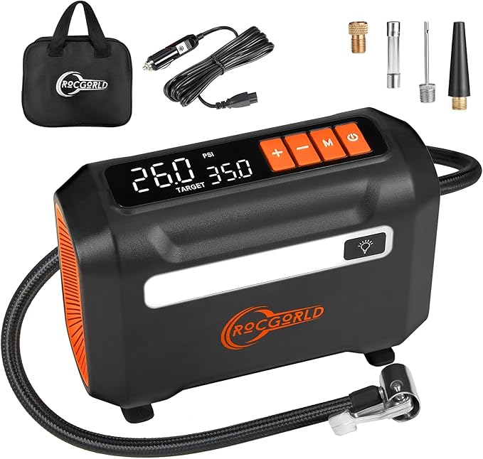 Dual Digital Display: A whole new experience our car air pump with a dual digital LED display showing real-time and preset pressure values, product status, and possible errors. The advanced chip ensures safe inflation with accurate pressure control and monitoring. Say goodbye to guesswork and hello to convenience with our user-friendly portable air compressor for car tires.
